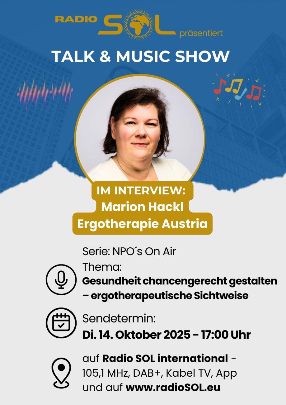 Unsere Präsidentin Marion Hackl ist am Dienstag, den 14. Oktober 2025, von 17:00 bis 17:30 Uhr zu Gast bei Radio SOL in der Talk & Music Show. Unter dem Titel „Gesundheit chancengerecht gestalten – ergotherapeutische Sichtweise“ spricht sie über die Bedeutung der Ergotherapie für eine faire Gesundheitsversorgung.